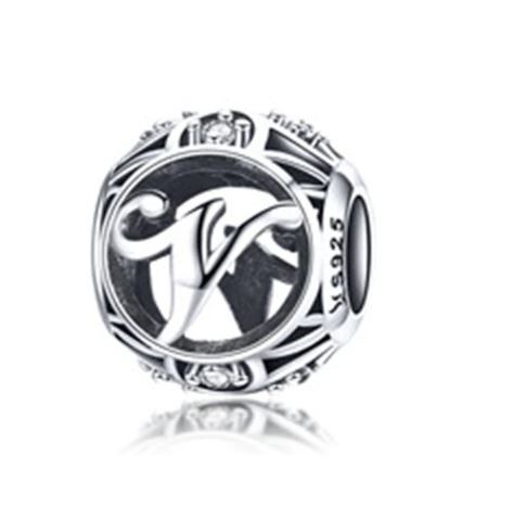 Detailný strieborný prívesok s písmenom v štýle vintage, zdobený drobnými zirkónovými kamienkami, na náramok alebo náhrdelník.