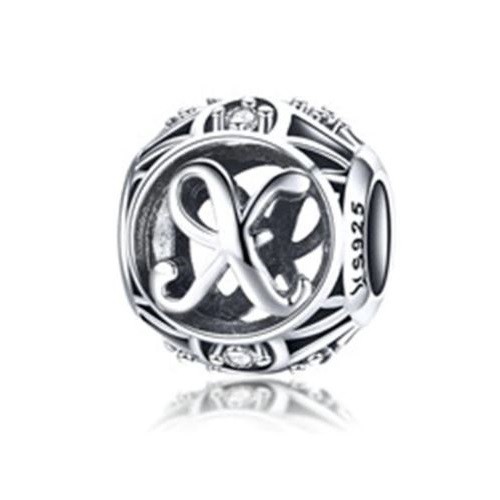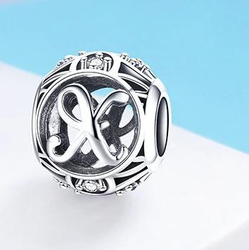 Detailný strieborný prívesok s písmenom vo vintage štýle, zdobený drobnými zirkónovými kamienkami, na náramok alebo náhrdelník.