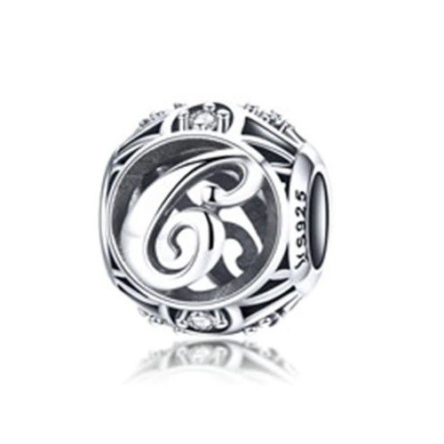 Detailný strieborný prívesok s písmenom vo vintage štýle, zdobený drobnými zirkónovými kamienkami, na náramok alebo náhrdelník.