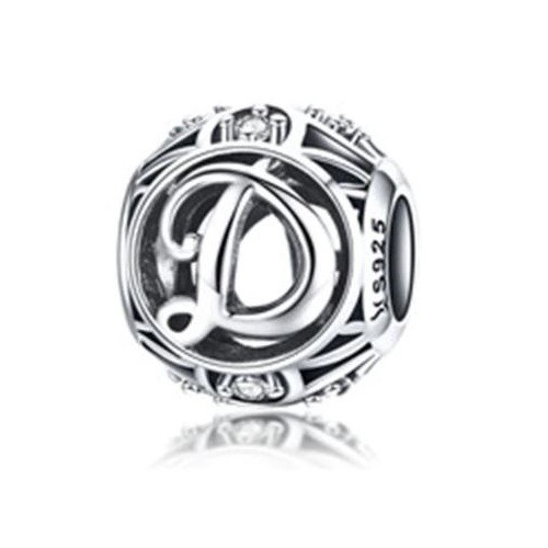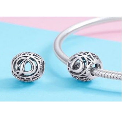 Detailný strieborný prívesok s písmenom vo vintage štýle, zdobený drobnými zirkónovými kamienkami, na náramok alebo náhrdelník.