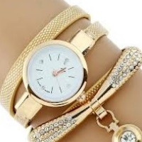 Mimoriadne elegantné dámske quartzové hodinky zlatej farby s jemným efektom zdobené kamienkami a príveskom, s odtieňom slonoviny.