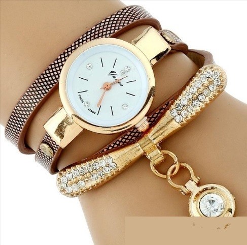 Mimoriadne elegantné, jemné efektné dámske kremenné hodinky zlatej farby, zdobené kamienkami a príveskom, s hnedým nádychom.