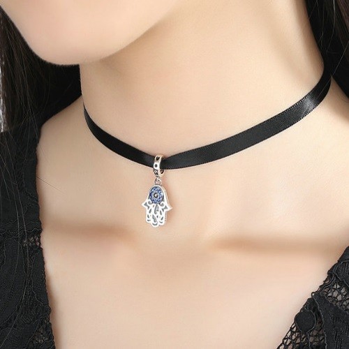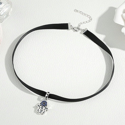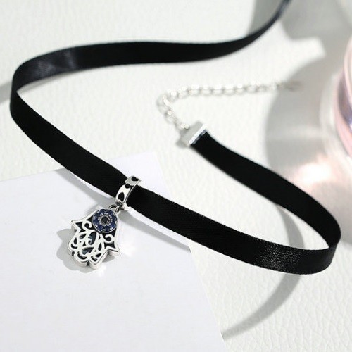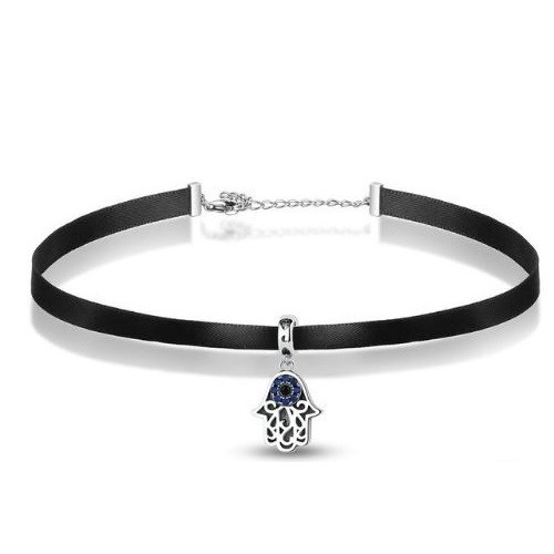 Čierny nákrčník klasického štýlu so strieborným príveskom. Dĺžka remienka je 31+7 cm, veľkosť prívesku je 2,5 x 1,4 cm.
