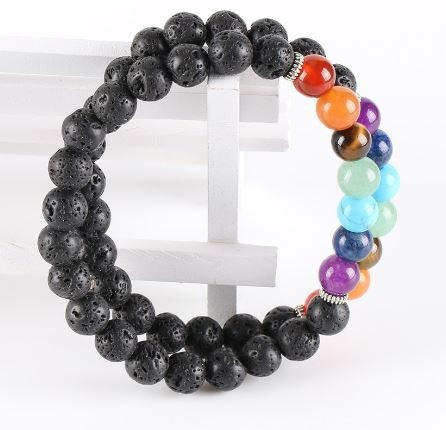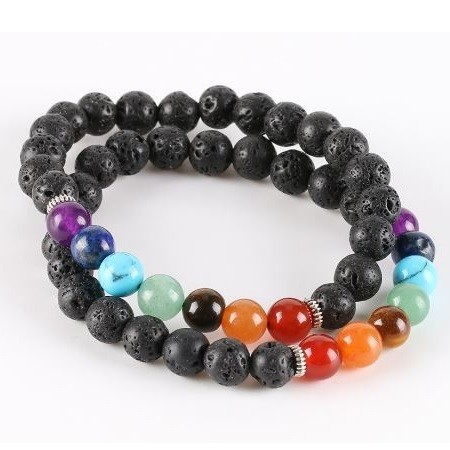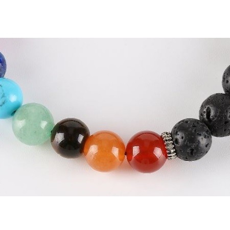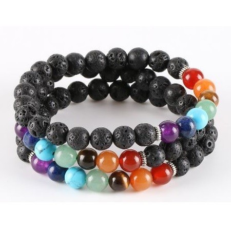 Náramok z čiernych lávových kameňov a farebných polodrahokamov. Lávové kamene sú porézne, takže dokážu absorbovať esenciálne oleje (napr. upokojujúcu levanduľu), takže ich môžete cítiť celý deň. Materiál dištančných podložiek je zliatina zinku s povrchovou úpravou starožitným striebrom. Dĺžka náramku je cca. 20,4 cm.