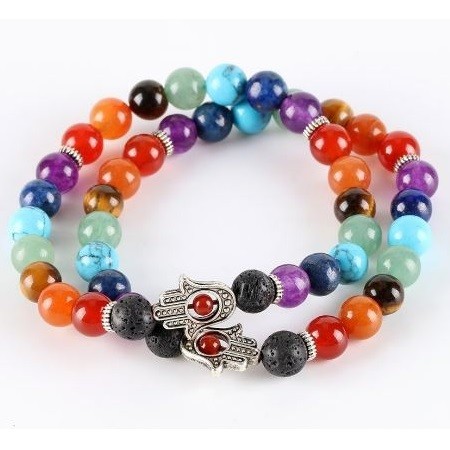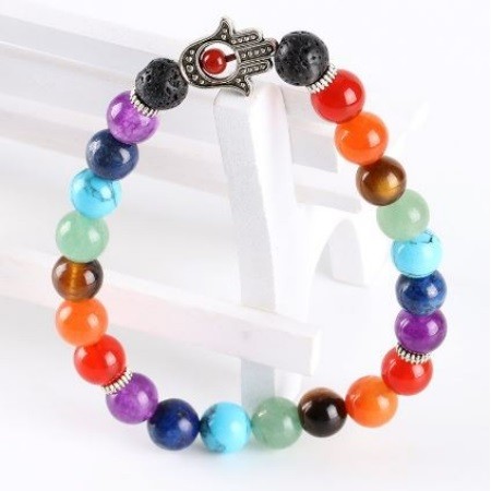 Čakrový harmonizujúci náramok s motívom Hand of Fatima a 8mm korálkami z polodrahokamu. Dĺžka náramku je cca. 20,5 cm, materiál medzikusov zliatina zinku, so starostrieborným povlakom.
