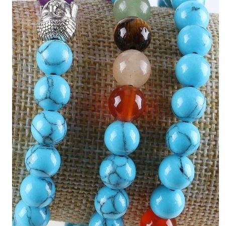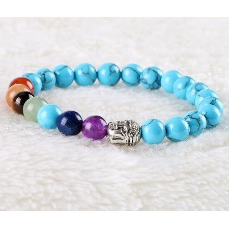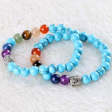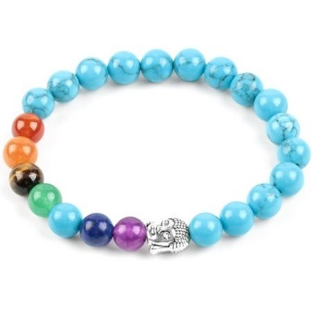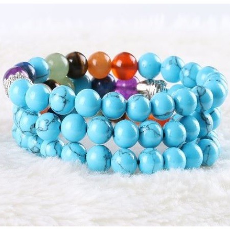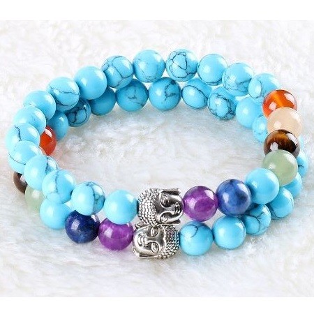 Meditačný náramok s hlavou Budhu a korálkami z polodrahokamu s priemerom 8 mm Vďaka vysokému obsahu medi sa tyrkys používa pri zápaloch hrdla a pľúc, zápaloch priedušiek a srdcových ťažkostiach. Pri poruchách reči stimuluje jasné a konkrétne vyjadrovanie myšlienok a pocitov. Jeho vibrácia otvára krčnú čakru, takže tyrkysová môže byť použitá na korekciu rečových chýb (napríklad koktanie), ale tiež nám pomáha nájsť správne slová v správnom čase. Nadmerné potenie, kŕče, neukojiteľná chuť do jedla, bulímia spôsobená psychickými problémami a krízami sa dá pomocou kameňa udržať v medziach. Účinok tyrkysu je mimoriadne rôznorodý, no pôsobí najmä na oblasť hrdla a dýchacie cesty. Môže sa použiť pri kašli a bronchitíde, bolesti hrdla, čiernom kašli, pseudokrupicii, všetkých druhoch pľúcnych chorôb, zápaloch pľúc, poruchách prehĺtania, prechladnutí a dokonca aj vtedy, keď je potrebné regulovať činnosť štítnej žľazy. Môže sa použiť aj na liečbu zápalu ďasien, krvácania ďasien alebo atrofie ďasien. Pôsobí na kĺby a svaly, je dobrý pri naťahovaní väzov, zápaloch či natrhnutiach, možno ho použiť aj proti svalovej horúčke a stuhnutosti svalov. Tyrkys pomáha detoxikovať a odkysľovať organizmus, takže mimoriadne dobre pôsobí aj na obličky. Zabraňuje tvorbe močových alebo obličkových kameňov. Jeho užívaním sa vstrebávajú aj edémy. Pomáha spaľovať tuk, preto ho dobre využijeme, ak držíme diétu. Tyrkys posilňuje pečeň, žľazy, oči a krvný obeh. Pomáha pri depresiách, chorobnej strate chuti do jedla (anorexia), nedostatku kyslíka, otrave krvi a strese.