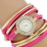 Dámsky quartz zdobený kamienkami, s vrkočovým efektom, s remienkom zdobeným zlatou aplikáciou, v ružovej farbe.