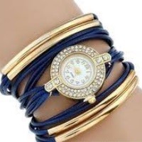 Dámsky quartz zdobený kamienkami, s vrkočovým efektom, s remienkom zdobeným zlatou aplikáciou, v modrej farbe.