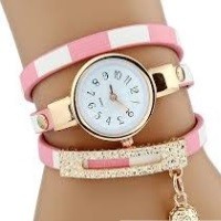 Mladé, ale pevné, módne kremenné hodinky v zlatej a ružovej farbe. Remienok je dlhý 56 cm, široký 11 mm, materiál je polyuretán,