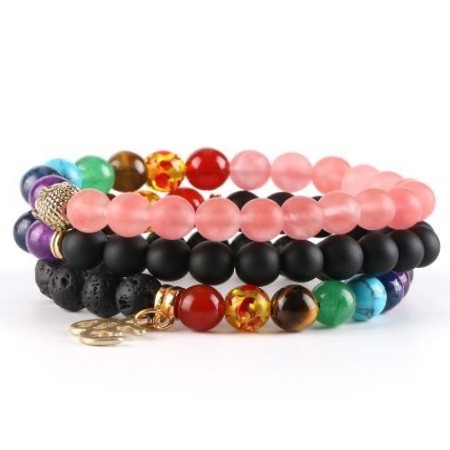 Náramok z čiernych lávových kameňov a farebných polodrahokamov so symbolom OM. Lávové kamene sú porézne, takže dokážu absorbovať esenciálne oleje (napr. upokojujúcu levanduľu), takže ich môžete cítiť celý deň.