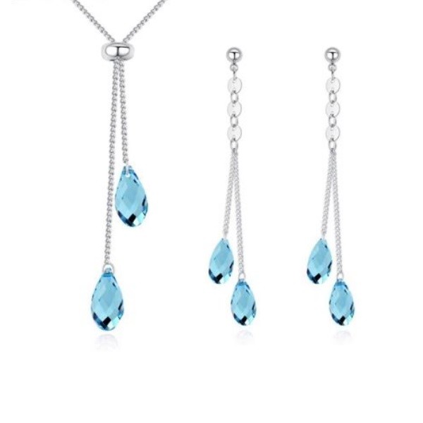 Elegantná súprava šperkov pozostávajúca z náhrdelníka a napichovacích náušníc. Tvar kvapky vody je vyrobený z krištáľu Swarovski. Veľkosť prívesku je 6,0 x 0,5 cm, náušnica 6,5 x 0,5 cm. Dĺžka náhrdelníka je 40 + 5 cm, materiál je rhodiovaná meď, ostatné časti sú z rhodiovanej zliatiny. Ihla náušnice je z nehrdzavejúcej lekárskej ocele.