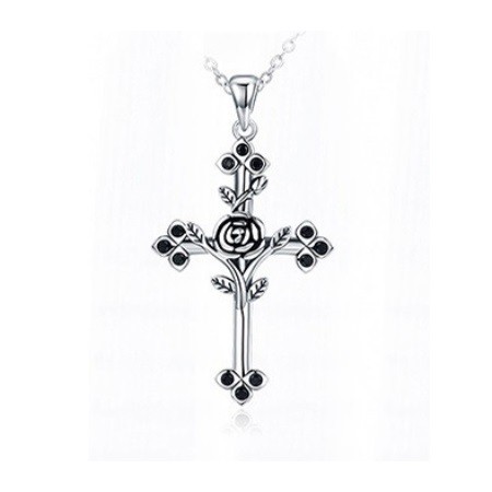 Kríž zdobený motívom ruže na príveskovej striebornej retiazke.