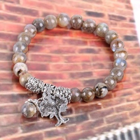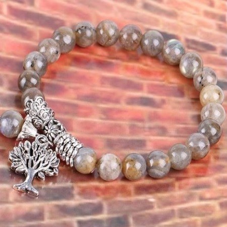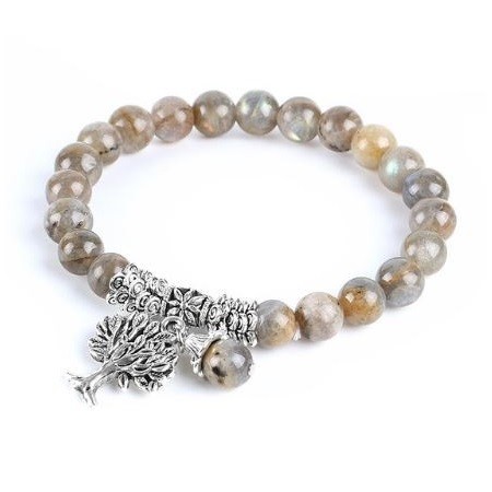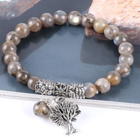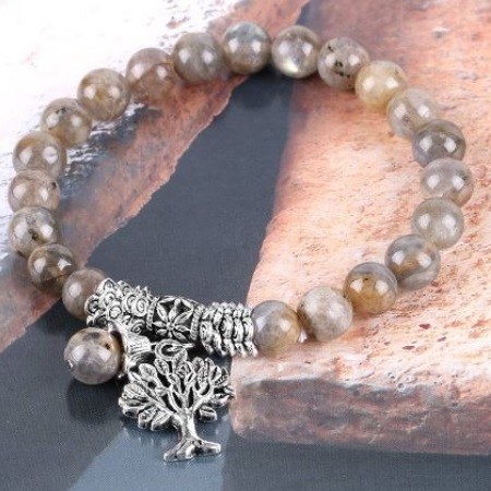 Meditačný náramok s 8 mm labradoritovými korálkami a príveskom strom života. Labradorit je pomocníkom očí a mozgu. Zmierňuje stres, upravuje metabolizmus. Lieči: prechladnutie, dnu, reumu, udržuje hormonálnu rovnováhu. Znižuje krvný tlak. Pri rádionickej liečbe presne určí príčinu poruchy.