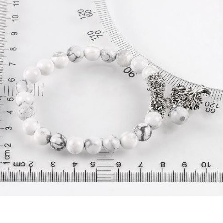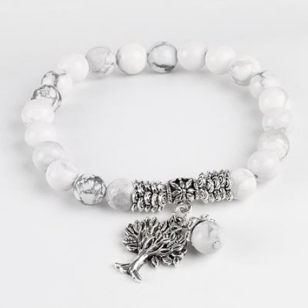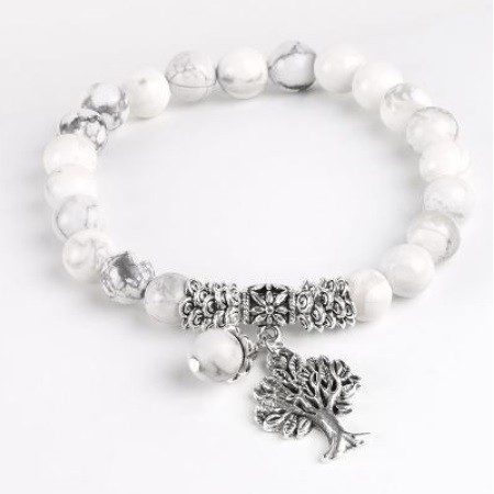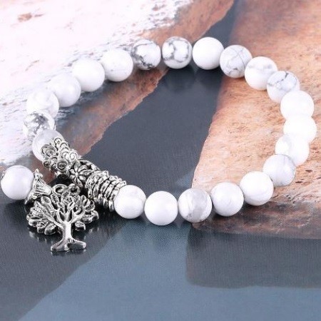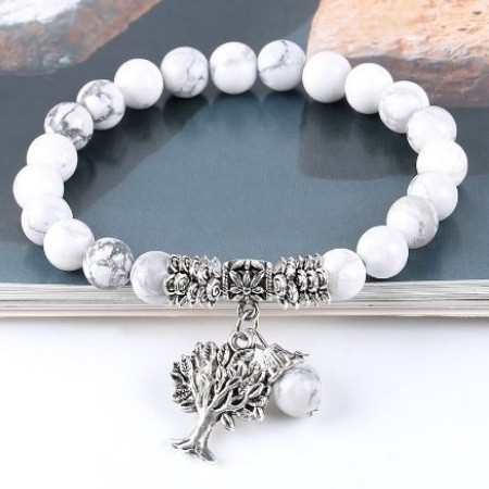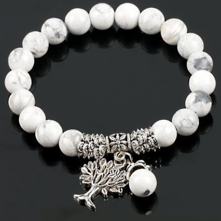 Meditačný náramok s 8 mm howlitovými korálkami a príveskom strom života. Howlit reguluje metabolizmus a znižuje zadržiavanie tekutín. Je považovaný za kameň pre tých, ktorí majú problémy s hmotnosťou, pretože pomáha pri chudnutí a detoxikácii. Reguluje rovnováhu kyselín, pomáha pri pálení záhy, črevných poruchách a nevoľnosti. Rozpúšťa naše blokády, ktoré spôsobujú zábrany a komplexy.