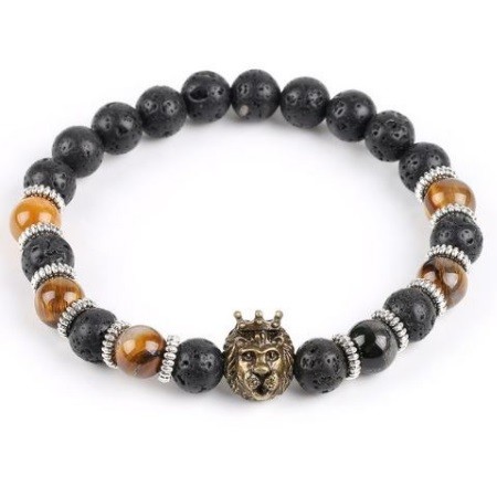 Starožitný bronzový náramok s hlavou leva s 8 mm tigrím okom a čiernymi korálkami z lávového kameňa. Tigrie oko má posilňujúci účinok na kosti a kĺby, pôsobí aj proti stuhnutosti pohybového aparátu. Posilňuje dýchacie cesty, a preto je účinným pomocníkom proti prechladnutiu, kašľu, dokonca aj zápalu priedušiek a astme. Je účinný proti širokému spektru nervových ochorení, od zápalu nervov cez epilepsiu až po schizofréniu.