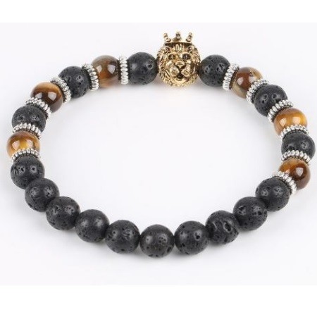 Starožitný zlatý náramok s hlavou leva s 8 mm tigrím okom a čiernymi korálkami z lávového kameňa. Tigrie oko má posilňujúci účinok na kosti a kĺby, pôsobí aj proti stuhnutosti pohybového aparátu. Posilňuje dýchacie cesty, a preto je účinným pomocníkom proti prechladnutiu, kašľu, dokonca aj zápalu priedušiek a astme. Je účinný proti širokému spektru nervových ochorení, od zápalu nervov cez epilepsiu až po schizofréniu.
