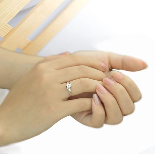 Zásnubný prsteň klasického štýlu vyrobený zo striebra zdobený bielym zirkónovým kryštálom. Váži 1,9 g, veľkosť veľkého kryštálu zirkónu je cca. 0,4 cm.
