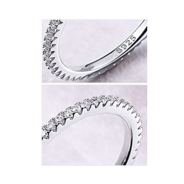 Tenký strieborný prsteň, zdobený drobnými bielymi kryštálmi zirkónu v kruhu. Má hrúbku 0,15 cm a váži 1,2 g.