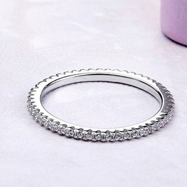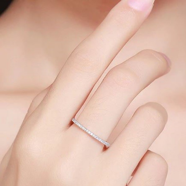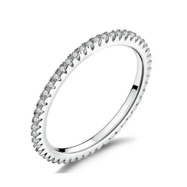 Tenký strieborný prsteň, zdobený drobnými bielymi kryštálmi zirkónu v kruhu. Má hrúbku 0,15 cm a váži 1,2 g.