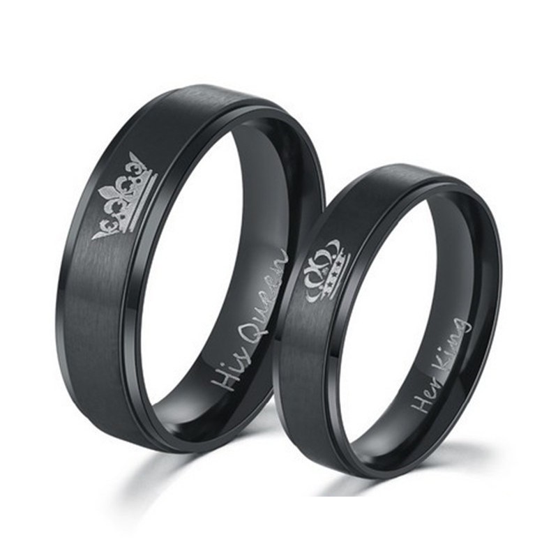 Dámska snubná obrúčka z ušľachtilej ocele, matná čierna, z vnútornej strany s nápisom "His Queen", z vonkajšej strany zdobená korunkou. Šírka obrúčky je 6 mm.