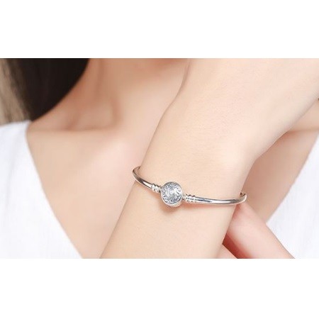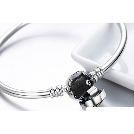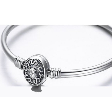 17 cm dlhý, hladký povrch strieborný náramok so skrytým bezpečnostným zapínaním, motívy hadov. Veľkosť prívesku je 1,1 x 1,1 cm.