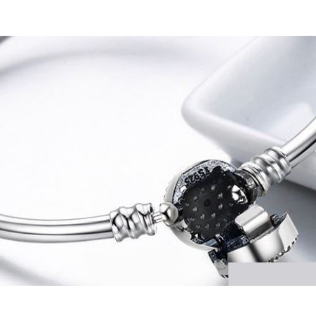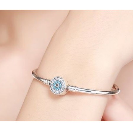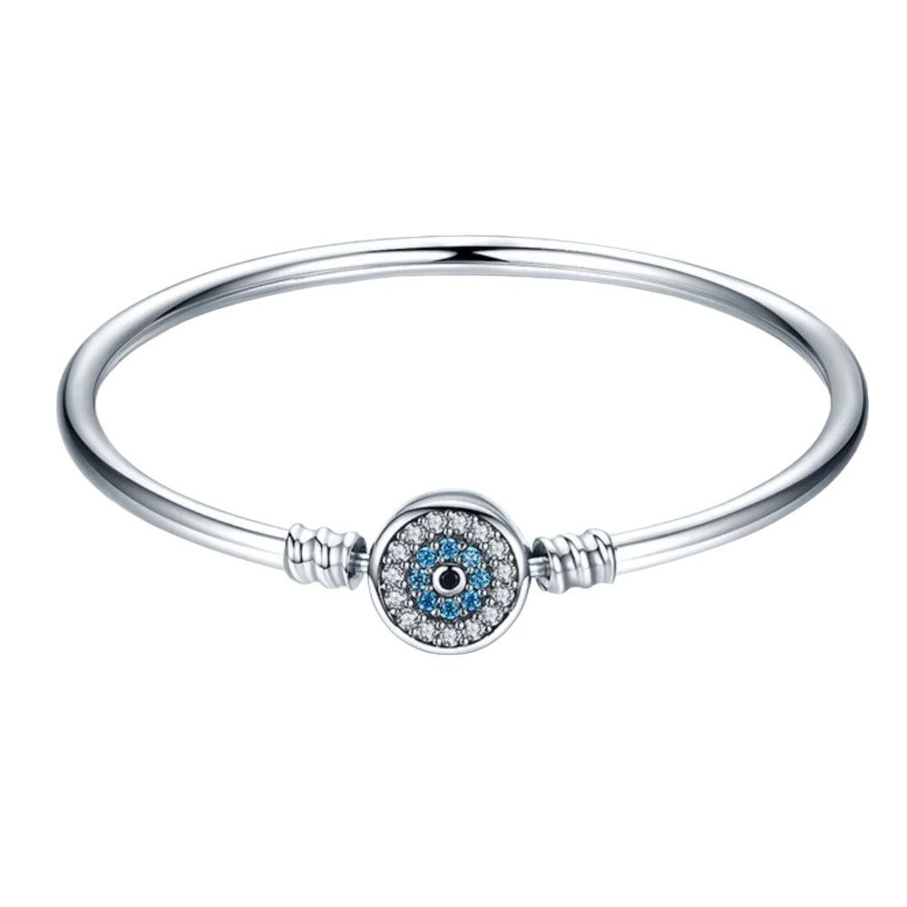 Strieborný náramok zdobený motívom modrých kamienkových očí.