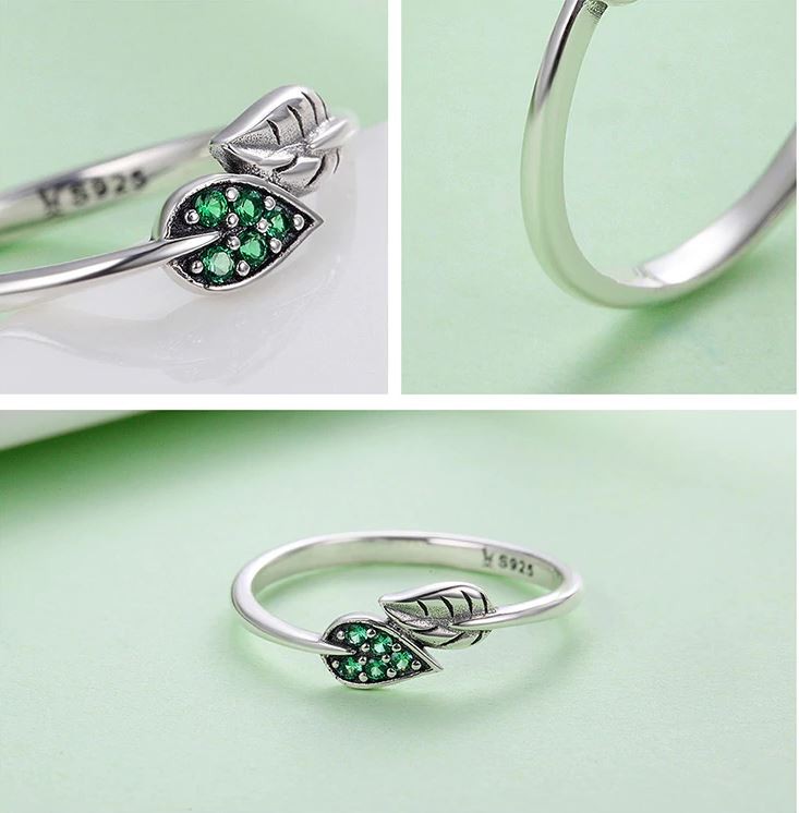 Elegantný strieborný prsteň s dvoma drevenými listami, jeden vykladaný malými zelenými zirkónovými kamienkami. Hrúbka prsteňa je 0,2 cm, váha 1,2 g.
