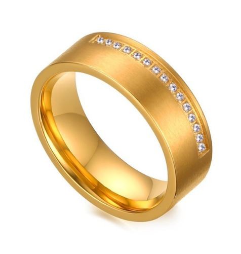 Dámska snubná obrúčka vyrobená z nerezovej ocele, s drobnými zirkónovými kamienkami, v matnej zlatej farbe. Šírka 7 mm, váha 6,0 g Snubná obrúčka je vyrobená z pevnej nerezovej ocele. Jeho farba je 100% odolná voči opotrebovaniu