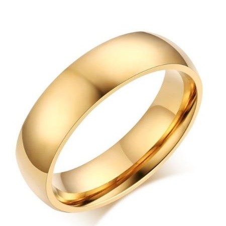 Klasicky vyzerajúci jednoduchý dámsky svadobný prsteň vyrobený z nerezovej ocele, lesklé zlato. Jeho šírka je 6 mm. Snubný prsteň je vyrobený z masívnej nehrdzavejúcej ocele. Jeho farba je 100% odolná voči opotrebovaniu