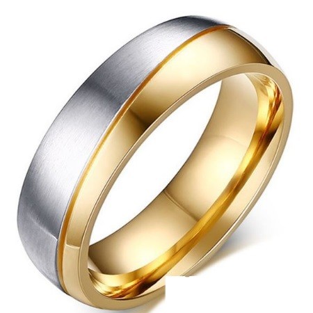Pánsky snubný prsteň z ušľachtilej ocele v zlatej farbe s asymetrickým strieborným pásom okolo. Šírka prsteňa je 6 mm.