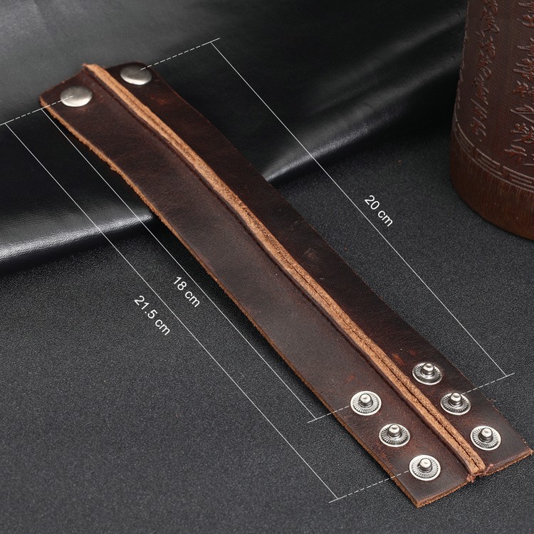 Široký pánsky kožený náramok s nastaviteľnou dĺžkou a kovovými sponami. Dĺžka 24,5 cm, šírka 4,5 cm.