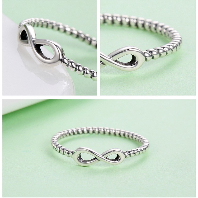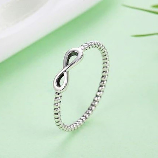 Strieborný prsteň s krúteným efektom, zdobený symbolom nekonečna. Prsteň má hrúbku 0,15 cm a hmotnosť 1,0 g. Dĺžka motívu je 1,0 cm.