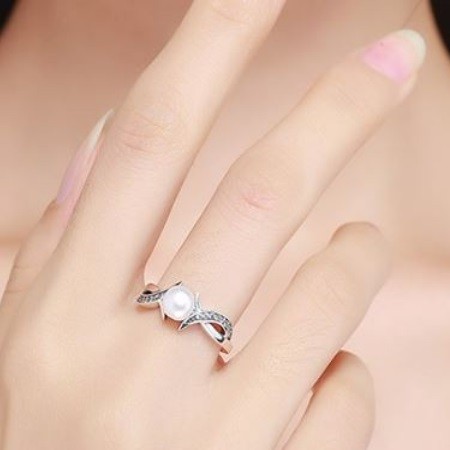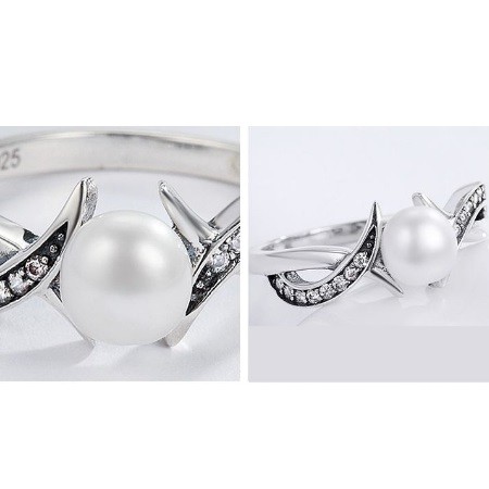 Strieborný prsteň s kamienkami, zdobený bielymi perlami.