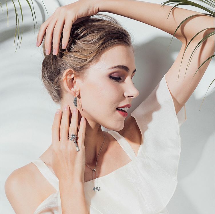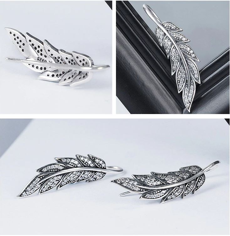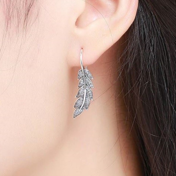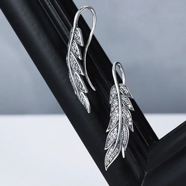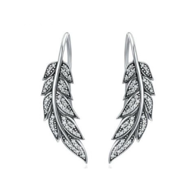 V tvare listu, krásne vypracované, visiace náušnice, bohato zdobené malými, bielymi zirkónovými kamienkami. Veľkosť náušnice je 3,2 x 0,9 cm, váha 3,9 g.