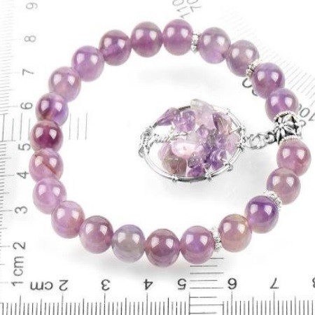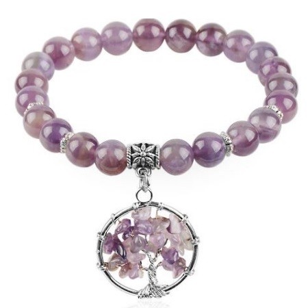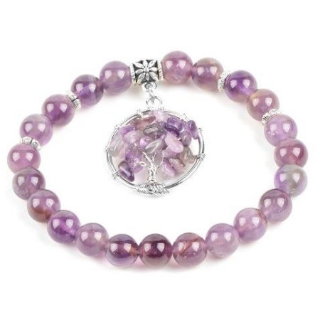 Meditačný náramok s 8 mm ametystovými korálkami a príveskom strom života. Ametyst môže byť účinným pomocníkom aj pre ľudí trpiacich dýchacími a astmatickými problémami. Zmierňuje bolesť hrdla, čistí krv, vyrovnáva krvný tlak, príp zlepšuje videnie a dokonca sa používa na liečbu farbosleposti. Priaznivo pôsobí pri kožných ochoreniach, často sa používa proti migrénovým bolestiam hlavy. Má silný detoxikačný účinok.
