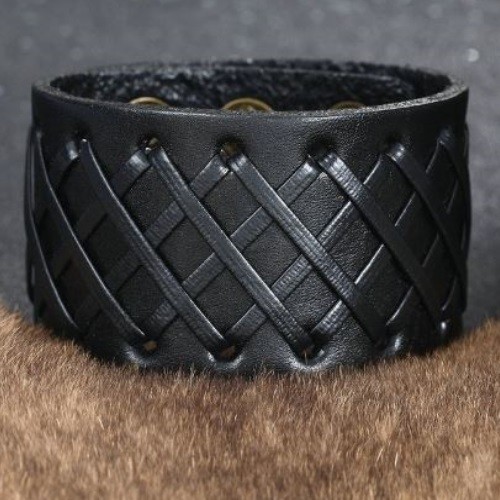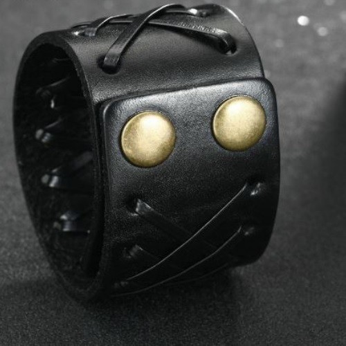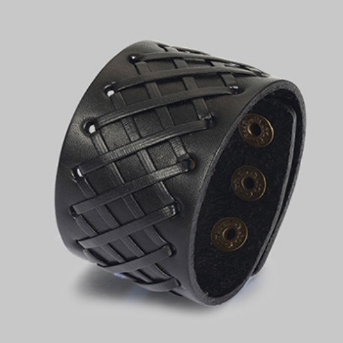 Široký pánsky náramok z kože s nastaviteľnou dĺžkou, s kovovými patentkami, s koženým pásikom prevlečeným cez otvory s kovovými okrajmi. Dĺžka 22,5 cm, šírka 4 cm.