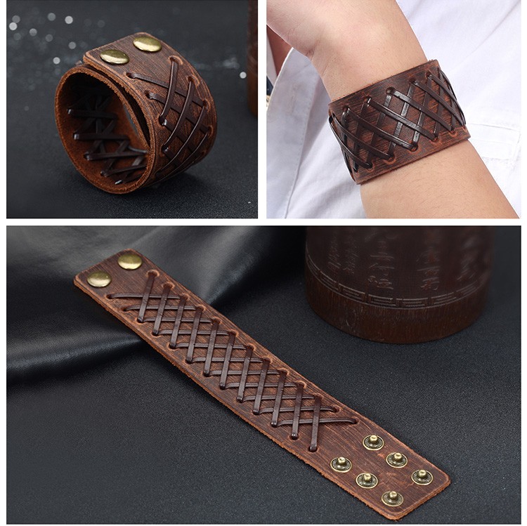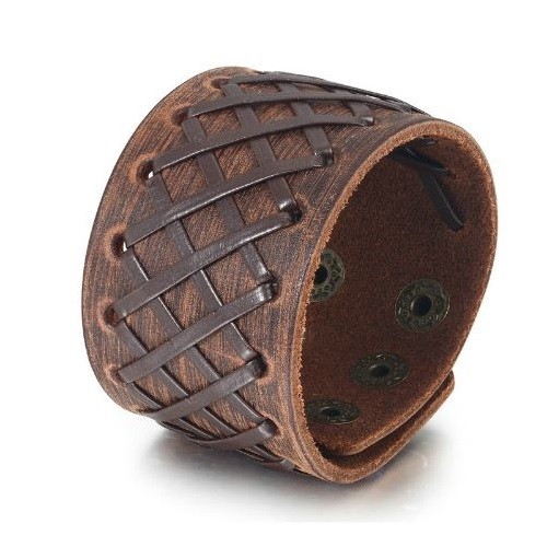 Široký pánsky náramok z kože s nastaviteľnou dĺžkou, s kovovými patentkami, s koženým pásikom prevlečeným cez otvory s kovovými okrajmi. Dĺžka 22,5 cm, šírka 4 cm.