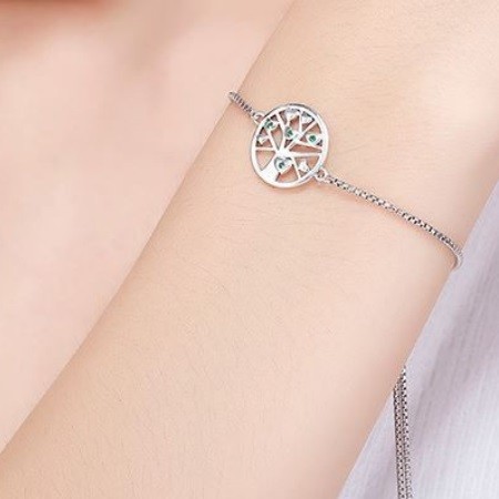 Strieborný tenisový náramok zdobený motívom stromu života vykladaným drobnými zelenými kamienkami.
