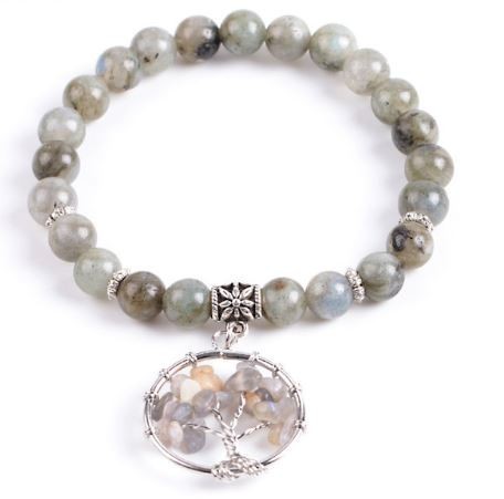 Meditačný náramok s 8 mm labradoritovými korálkami a príveskom strom života. Labradorit je pomocníkom očí a mozgu. Zmierňuje stres, upravuje metabolizmus. Lieči: prechladnutie, dnu, reumu, udržuje hormonálnu rovnováhu. Znižuje krvný tlak. Pri rádionickej liečbe presne určí príčinu poruchy.