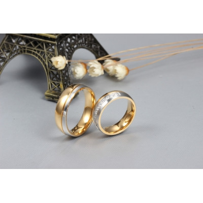 Pánsky snubný prsteň z ušľachtilej ocele s pásikom striebornej farby po obvode v zlatej farbe. Šírka prsteňa je 6 mm, hrúbka je 2 mm, váha prsteňa je 5 g. Jeho farba je 100% odolná proti opotrebovaniu