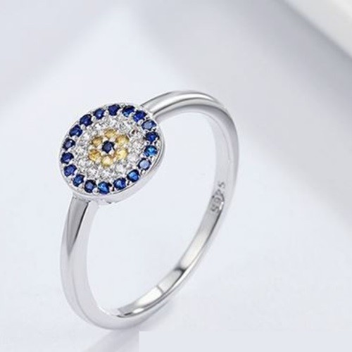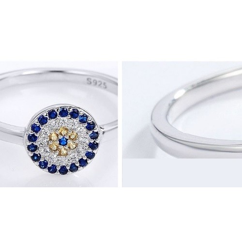 Strieborný prsteň široký 0,2 cm s motívom ochranného oka, zdobený modrými, bielymi a zlatými zirkónovými kamienkami.