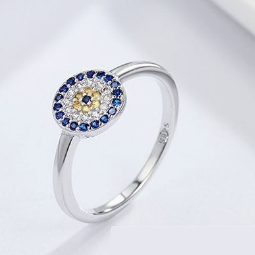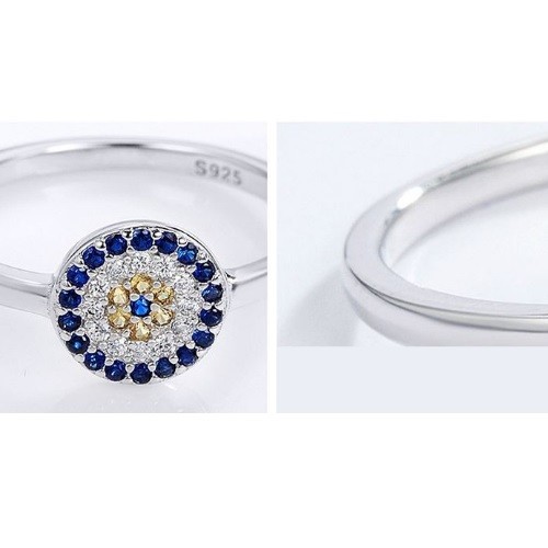 Strieborný prsteň zdobený motívom oka vykladaný farebnými kamienkami.