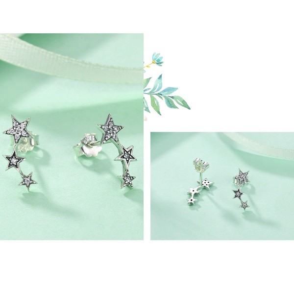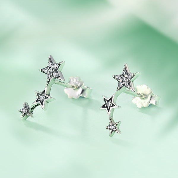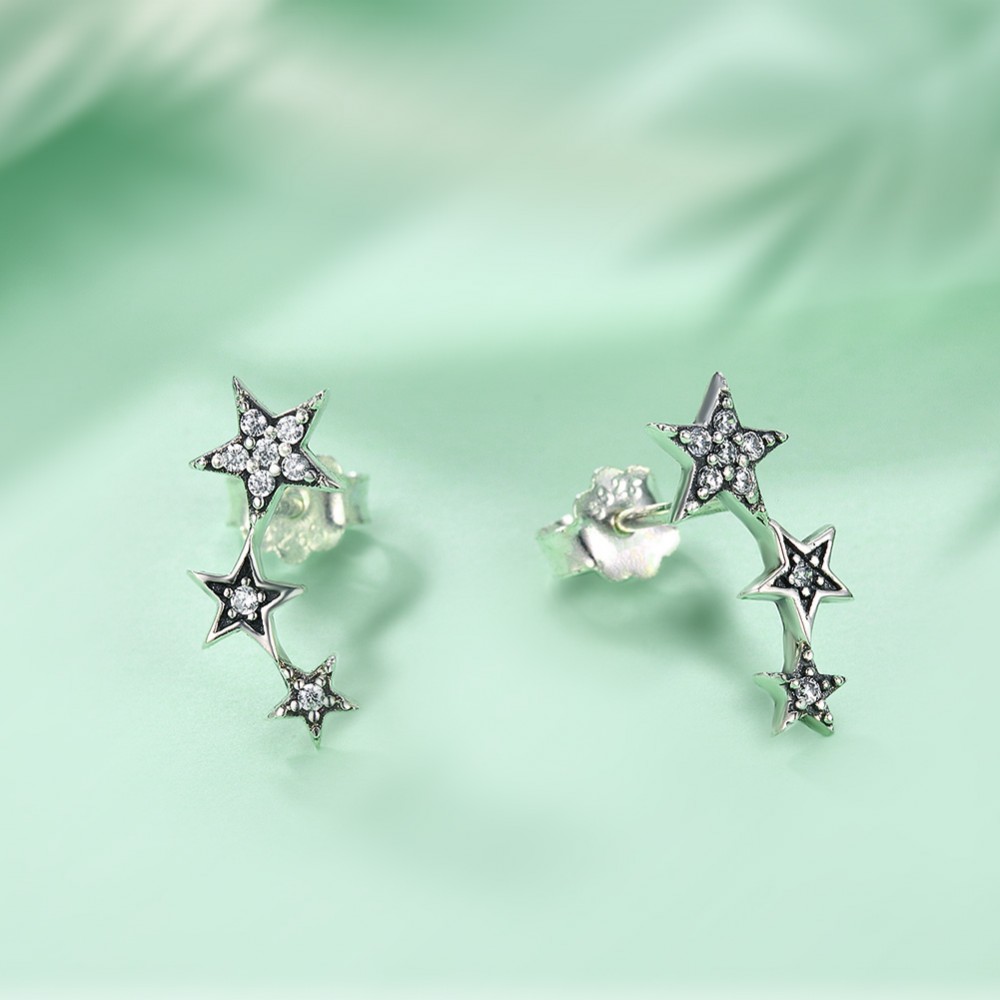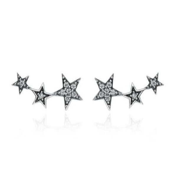 Ozdobné strieborné náušnice s tromi hviezdami rôznych veľkostí, zdobené malými bielymi zirkónovými kamienkami.