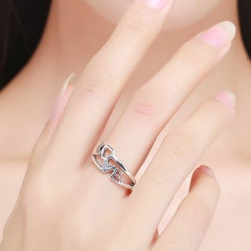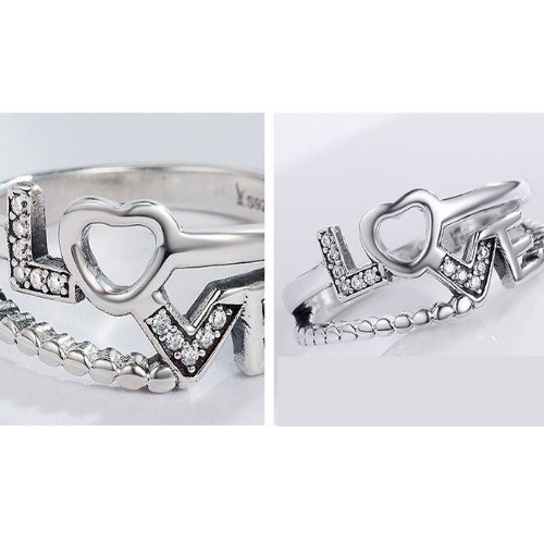 Strieborný prsteň s nápisom LOVE a zdobený kamienkami.