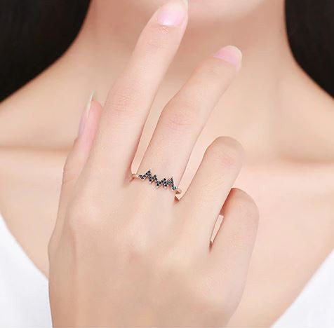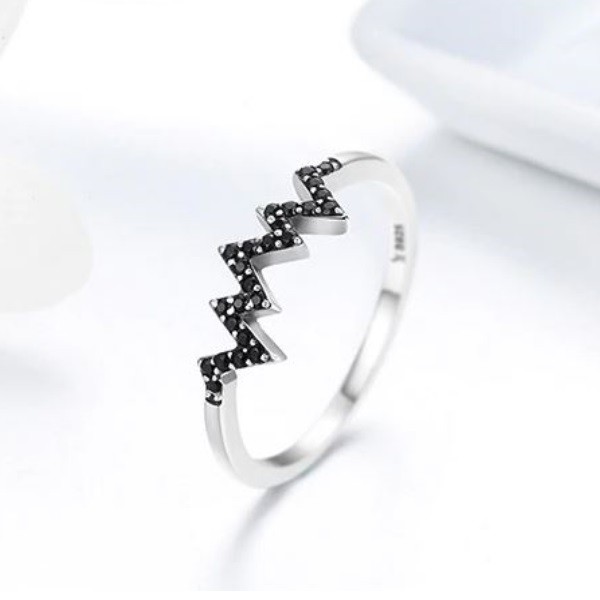Špeciálny strieborný prsteň s EKG motívom, zdobený čiernym zirkónovým kryštálom. Prsteň má veľkosť 0,12 cm a hmotnosť 1,34 g.