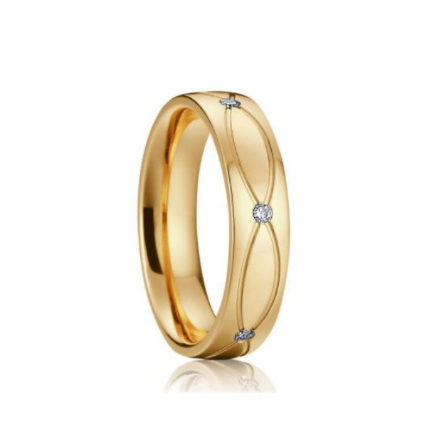 Jednoduchý, no elegantný dámsky snubný prsteň z titánovej ocele, zdobený vlnkou prechádzajúcou stredom a kúskom zirkónového kameňa. Jeho šírka je 5 mm.