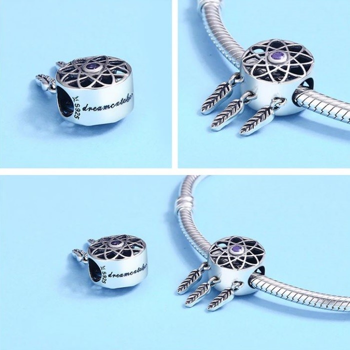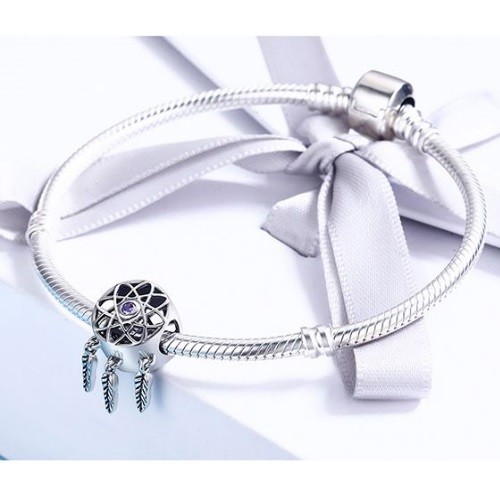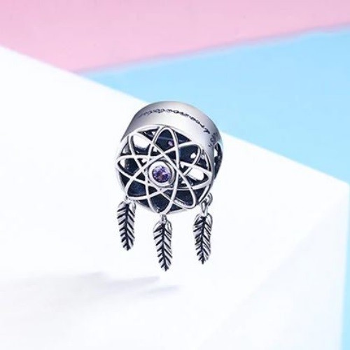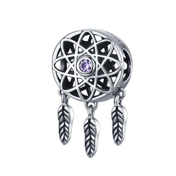 Prívesok lapač snov vyrobený zo striebra, zdobený drobným fialovým zirkónovým kryštálom. Na náramok alebo náhrdelník. Váži 1,8 g.