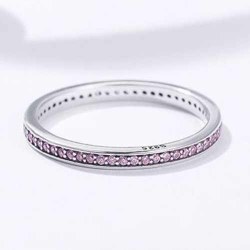 Strieborný prsteň zdobený fialovými kryštálmi. Jeho šírka je 0,2 cm, váha 1,5 g.