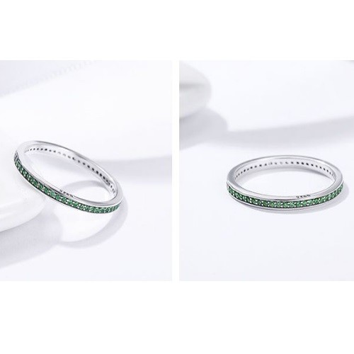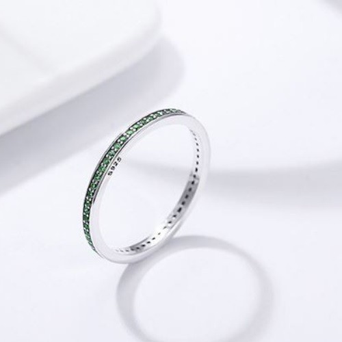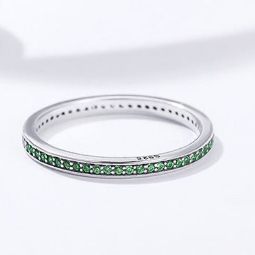 Strieborný prsteň zdobený zelenými kryštálmi. Jeho šírka je 0,2 cm, váha 1,5 g.