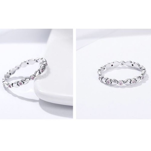 Strieborný dámsky prsteň posiaty drobnými fialovými kryštálmi. Jeho šírka je 0,3 cm, váha 1,5 g.